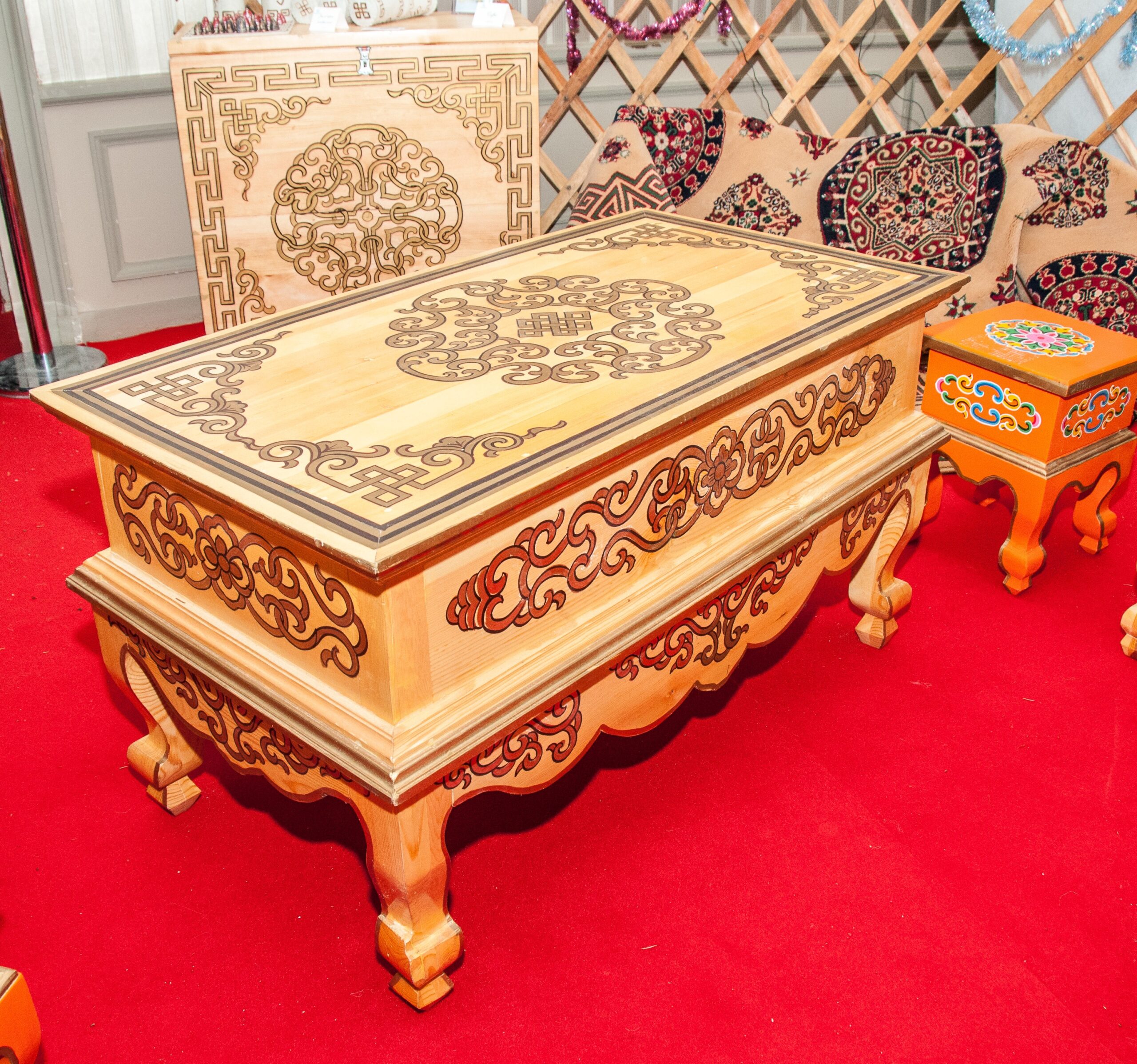 varnished natural wood, traditional chocolate-gold decorations